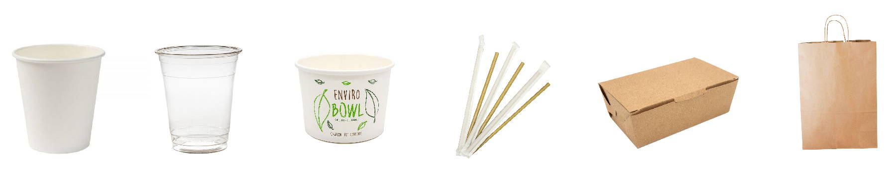 Coffee Cups - Cold Cups - Enviro Bowls - Individually Wrapped Straws - Kraft Deli Boxes - Kraft Paper Bags