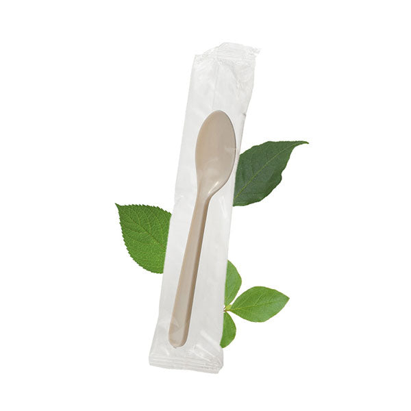 The Wrapped Cornstarch Teaspoon offers a sustainable alternative, while still giving the strength and stability of a conventional plastic utensil. Our Plant Starch Utensils are made from 70% renewable resources, replacing 70% of the oil in production, with plant starch. They are excellent for hot foods (heat tolerance up to 120° C), and can be used in the microwave.