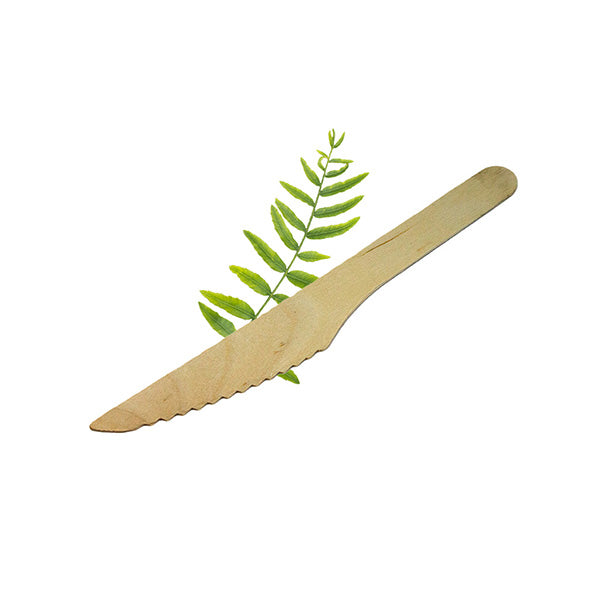 The Enviromall disposable 160mm wooden knife is not only an environmentally smart decision, but also completely functional. Enviromall's disposable wooden cutlery is 100% natural and 100% compostable. They are very sturdy and do not easily split or splinter. They are perfect for hot or cold food. The wood is smooth and comfortable in your hand. These disposable dinner utensils are accepted at composting facilities because they are composed of completely organic material: birch wood and nothing else. Only hot water is used to soften, form and sterilize the cutlery. There are no coatings of any kind and this process does not use any chemicals which would slow down the decomposing process as well as pollute our soil, streams, lakes and oceans. Enviromall's disposable wooden cutlery is made from renewable resources of FSC certified birch wood. Just as trees naturally decompose, so does our compostable wooden forks, spoons and knives. The amount of time mostly depends on where and how they are disposed. With ideal conditions our wood cutlery could completely decompose in about 90 days. When conditions are drier than ideal, it would take much longer. Going green has never been easier